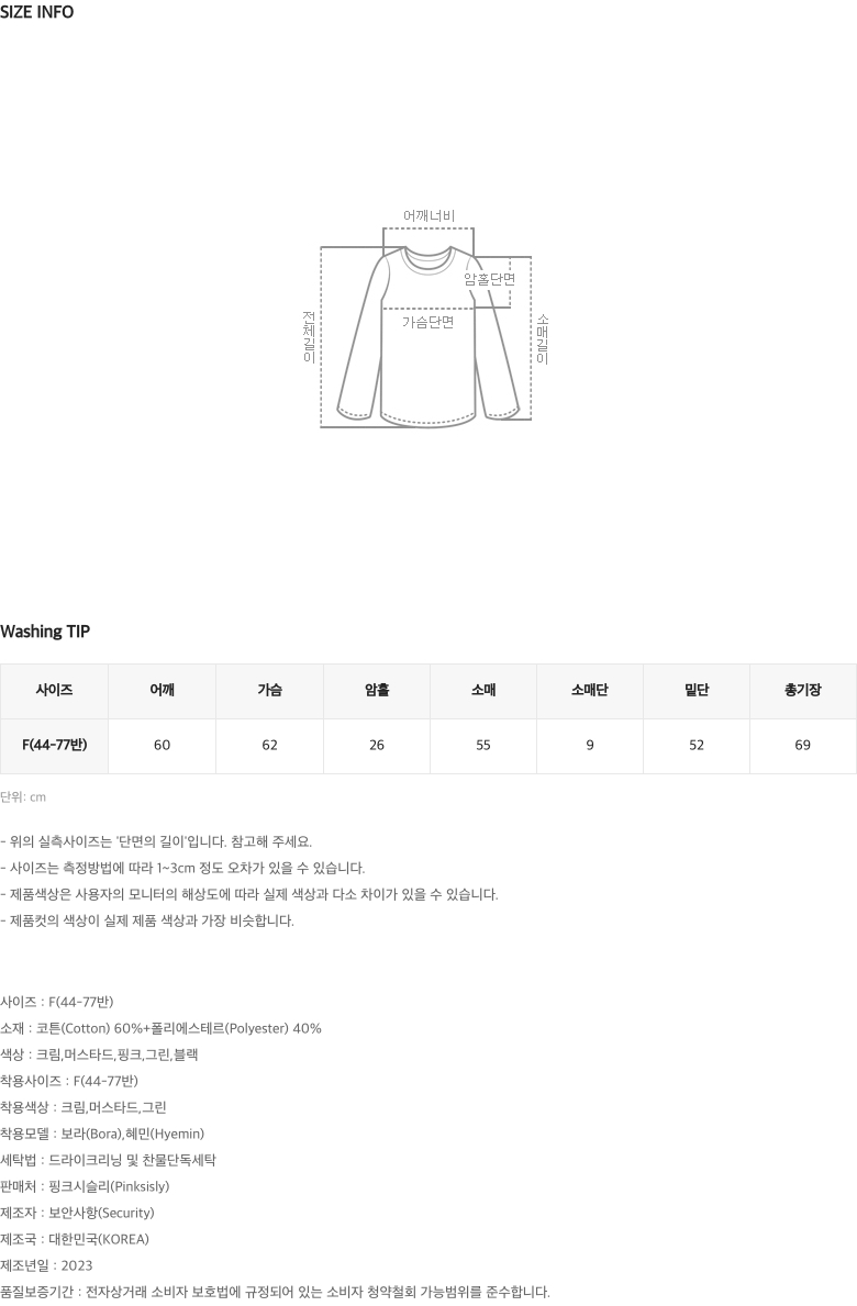 | 비침 | 밝은 컬러의 경우 비침이 있을 수 있습니다 |