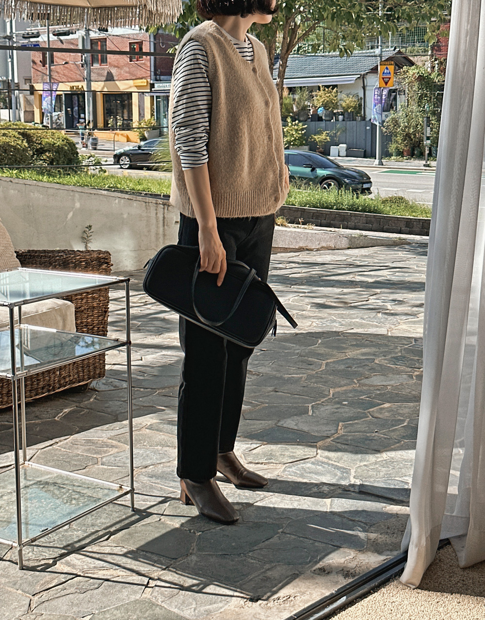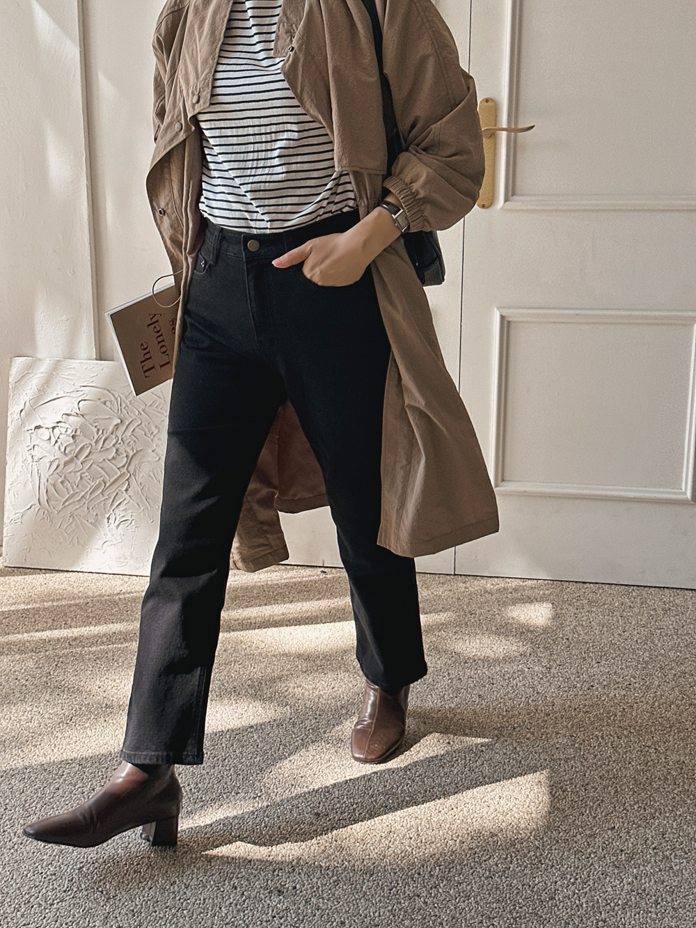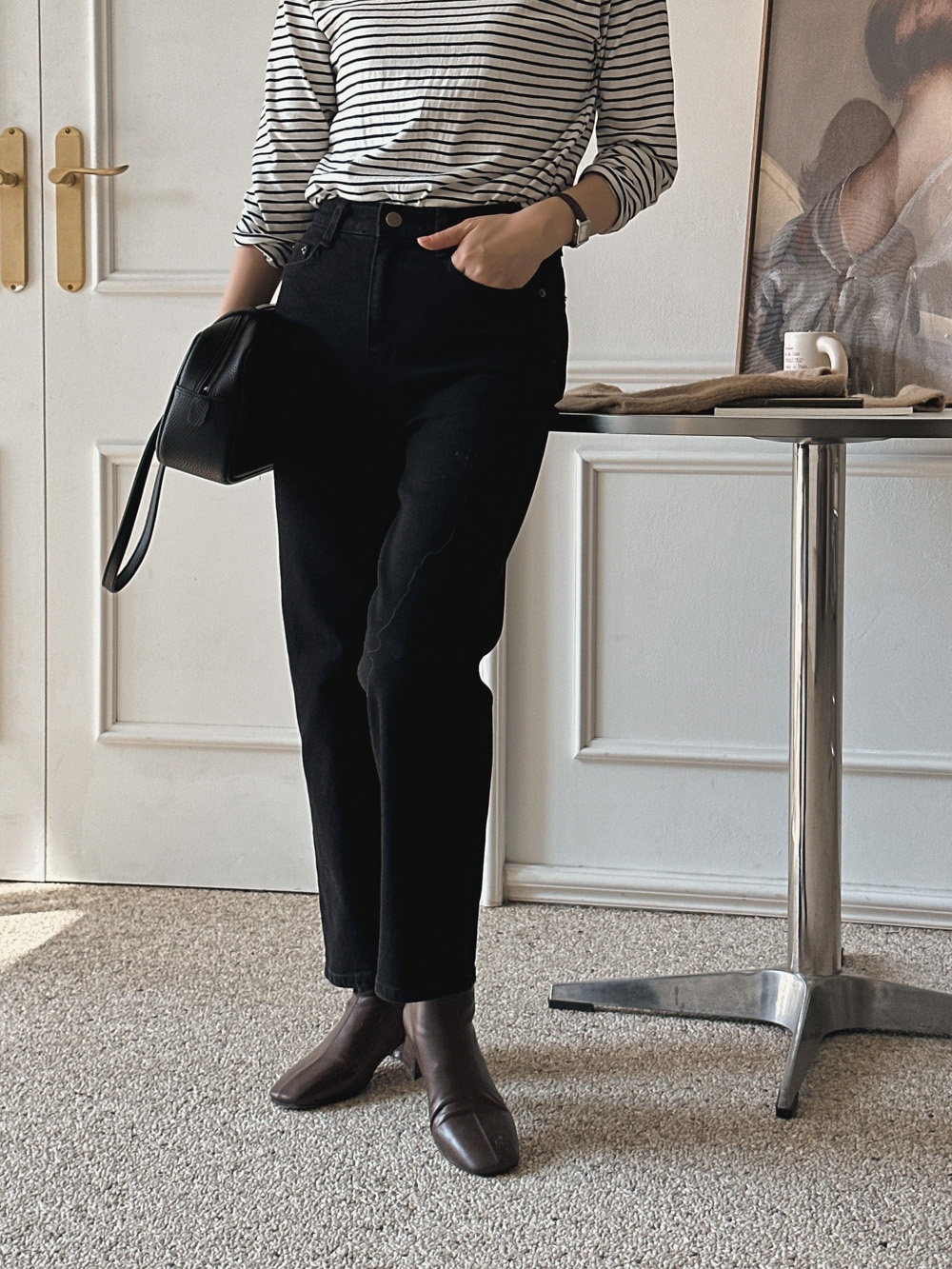 살짝이 배기핏 라인을 연출해 주는 블랙데님팬츠.\