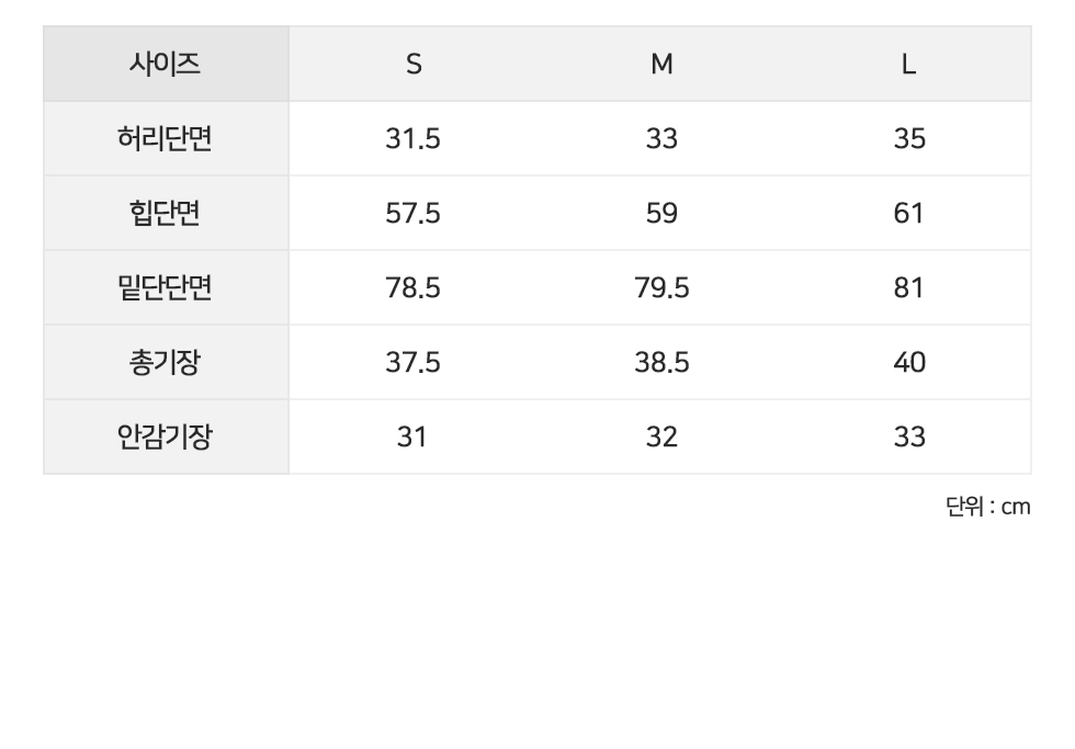 S 허리단면31.5 힙단면57.5 밑단단면78.5 총기장37.5 안감기장31