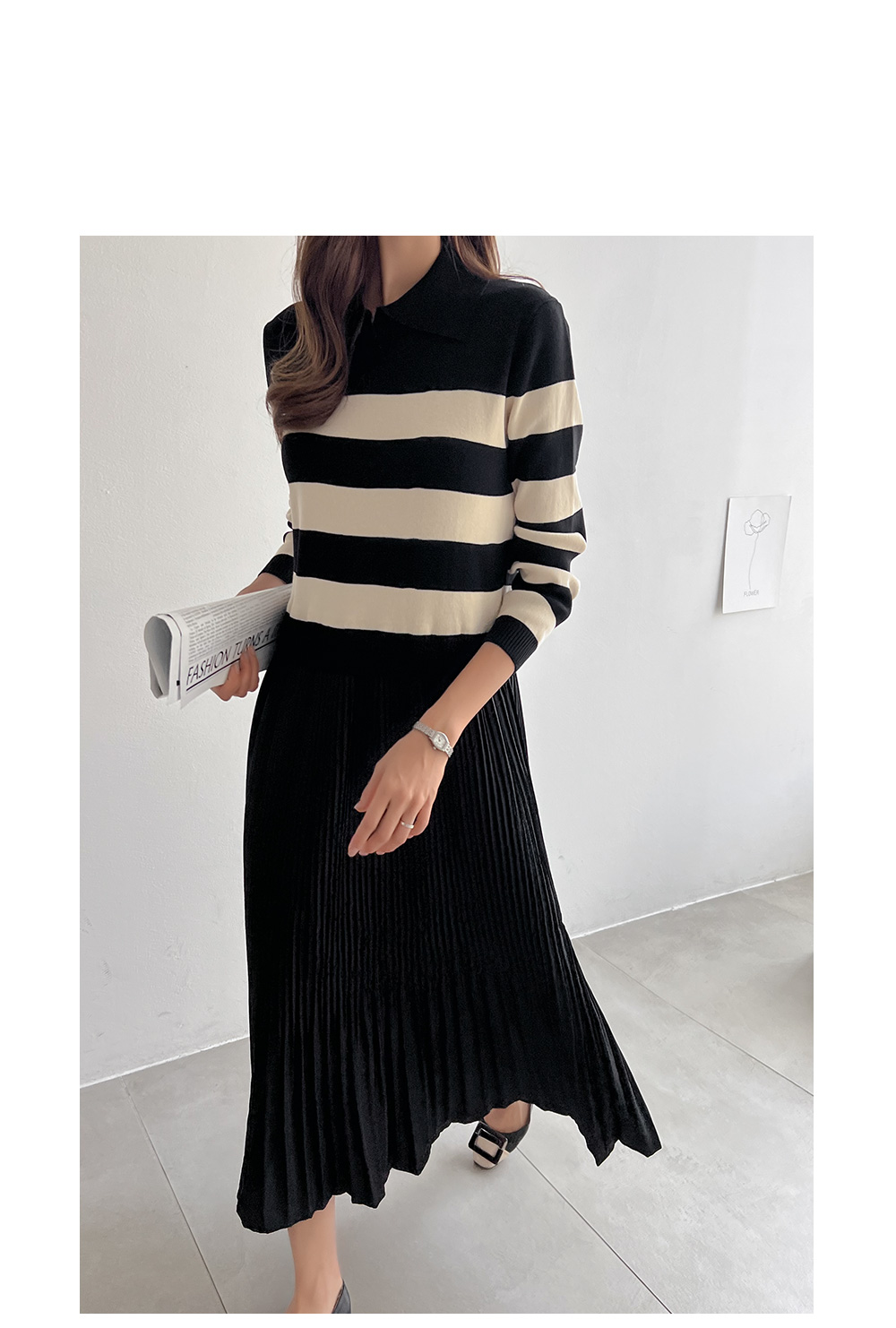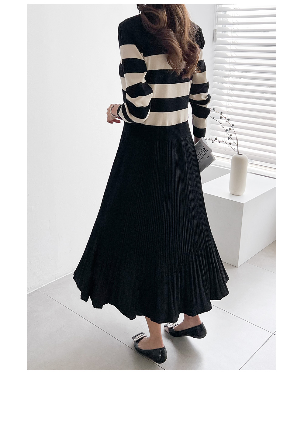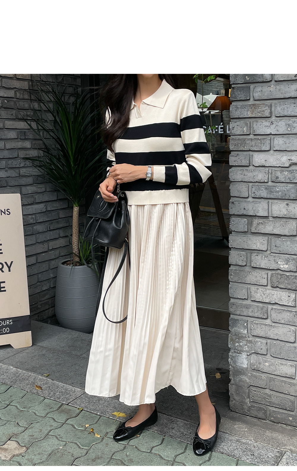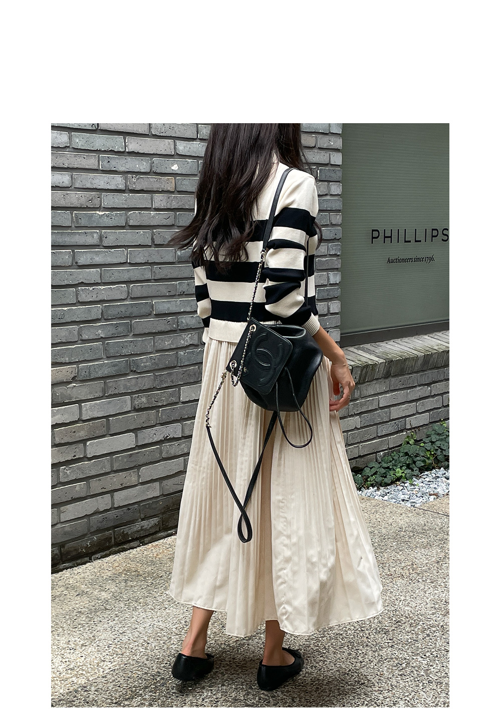 스트라이프 니트와 플리츠 롱 스커트를 입은듯~