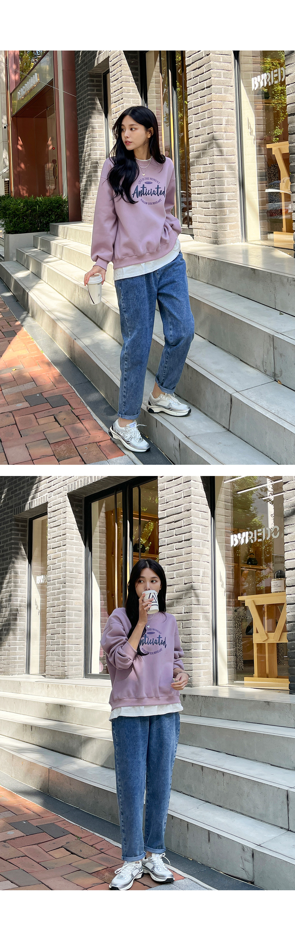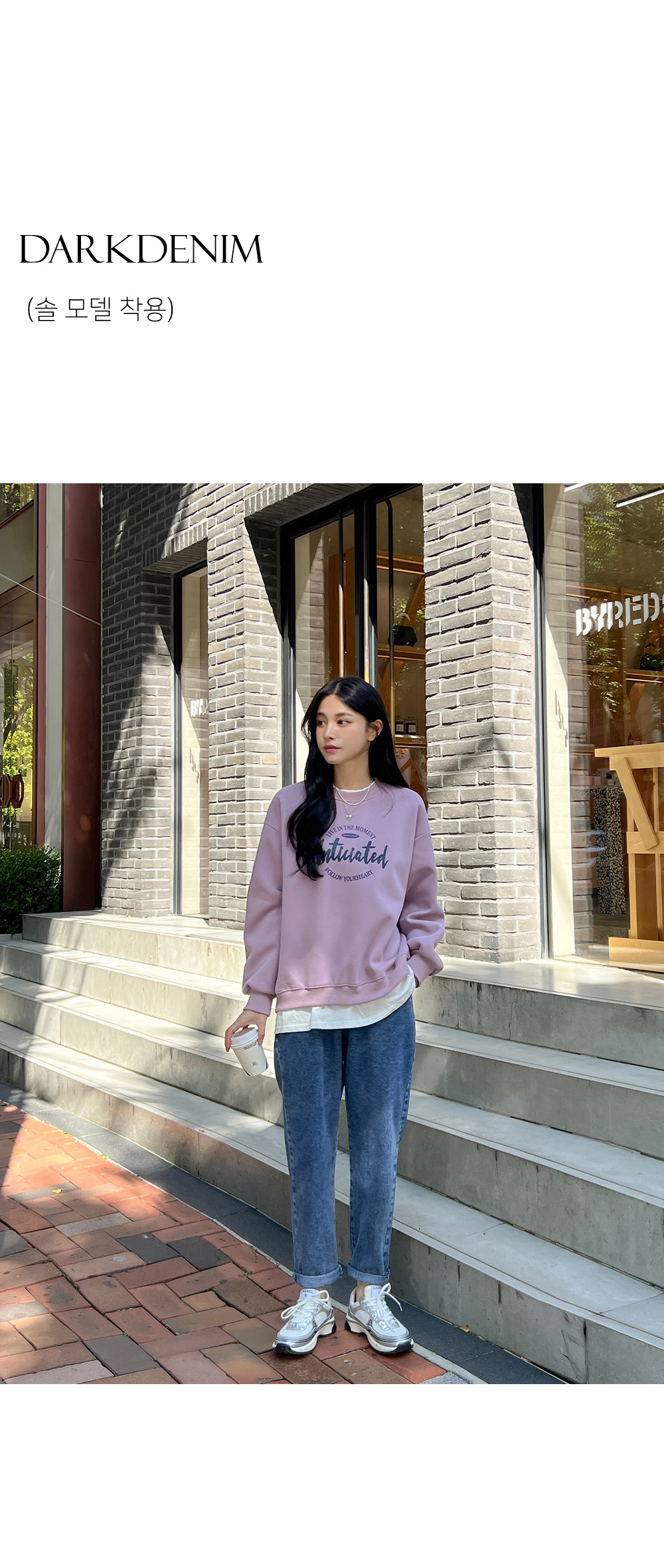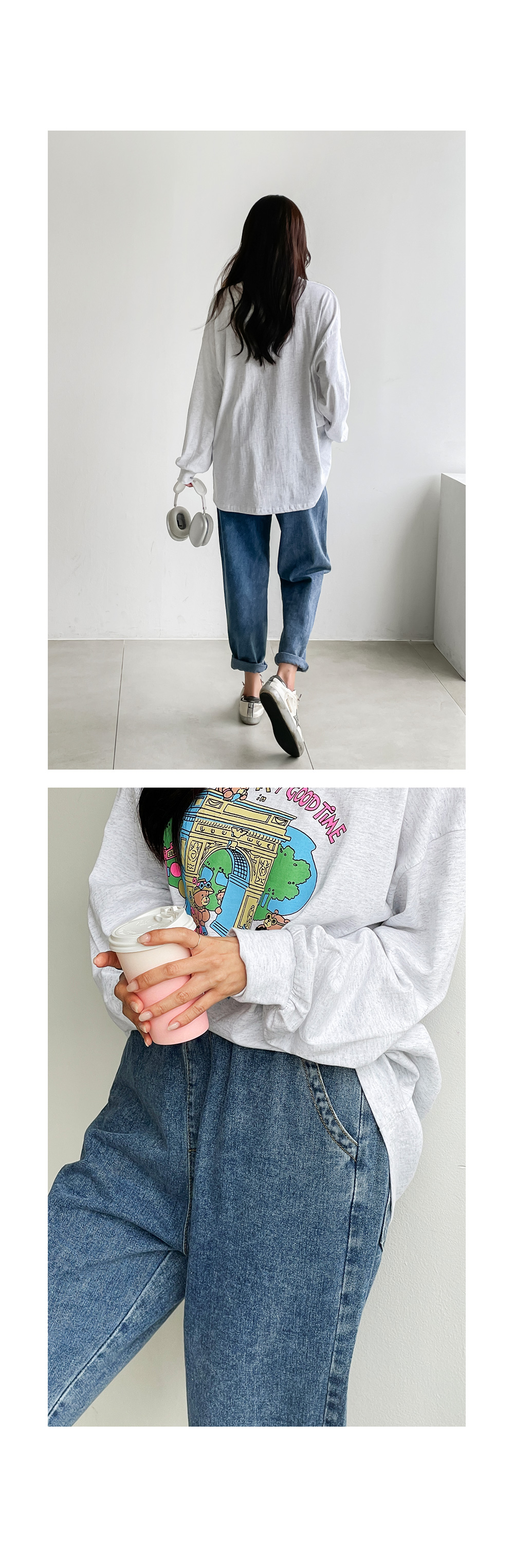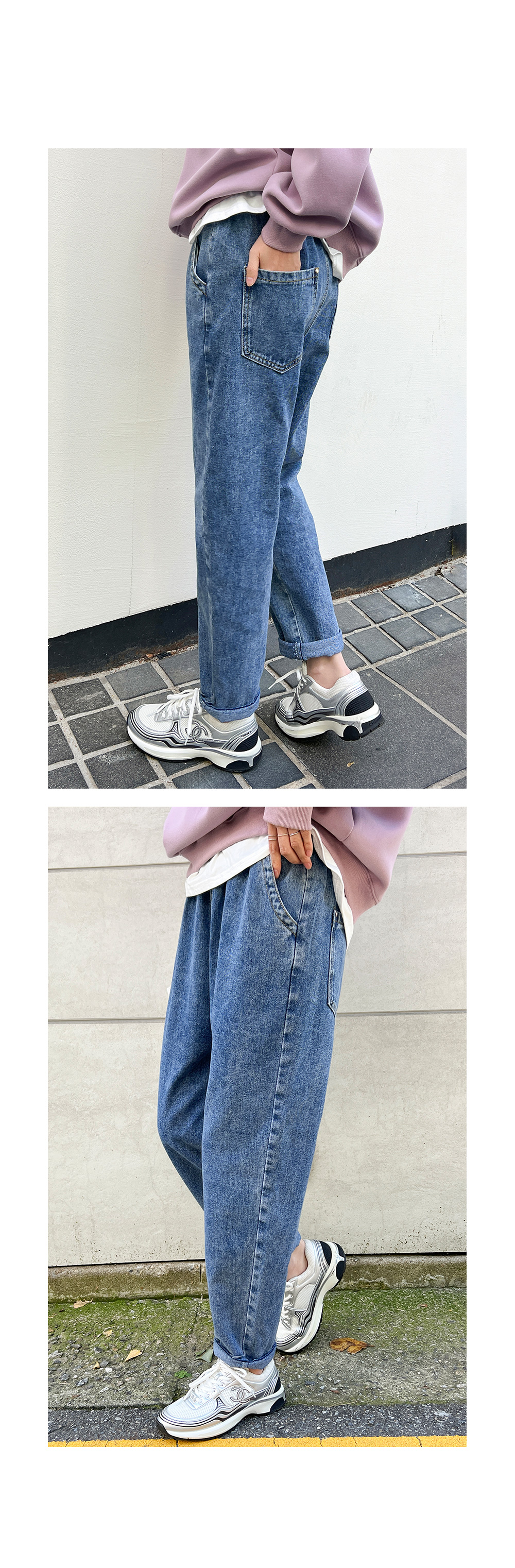 여유있게 떨어지는 배기 핏으로 다리 군살을 잘 커버해주어요.