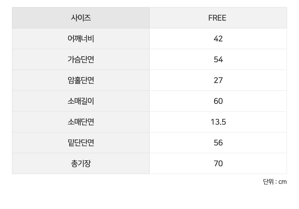 소매길이60 소매단면13.5 밑단단면56 총기장70