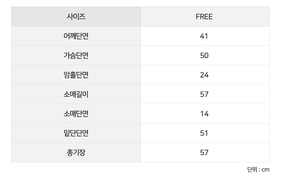 소매길이57 소매단면14 밑단단면51 총기장57