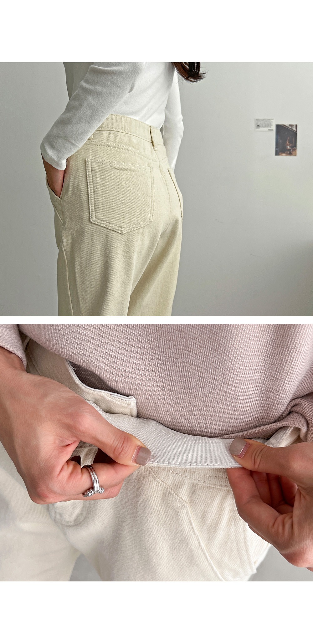 부드러운 기모안감에 신축성이 있는 면 소재, 허리 히든밴딩으로
