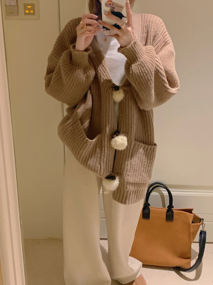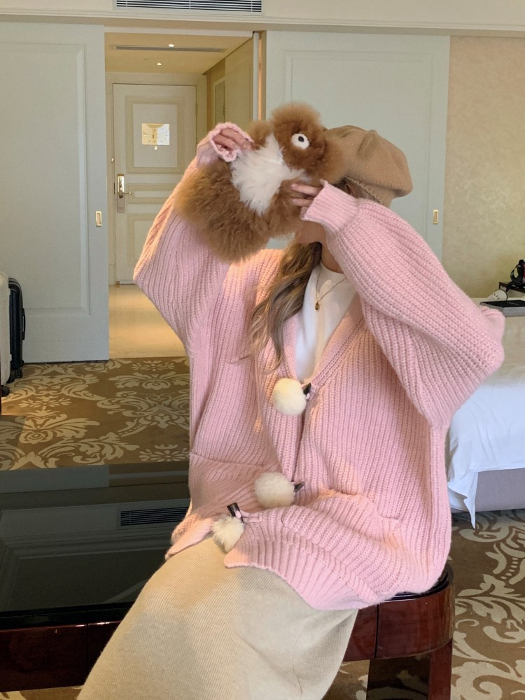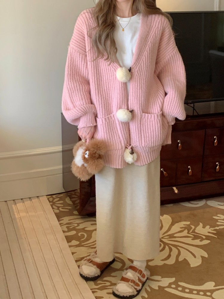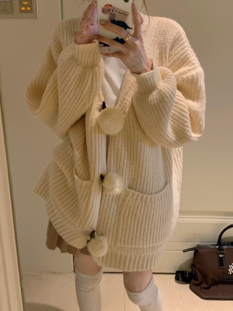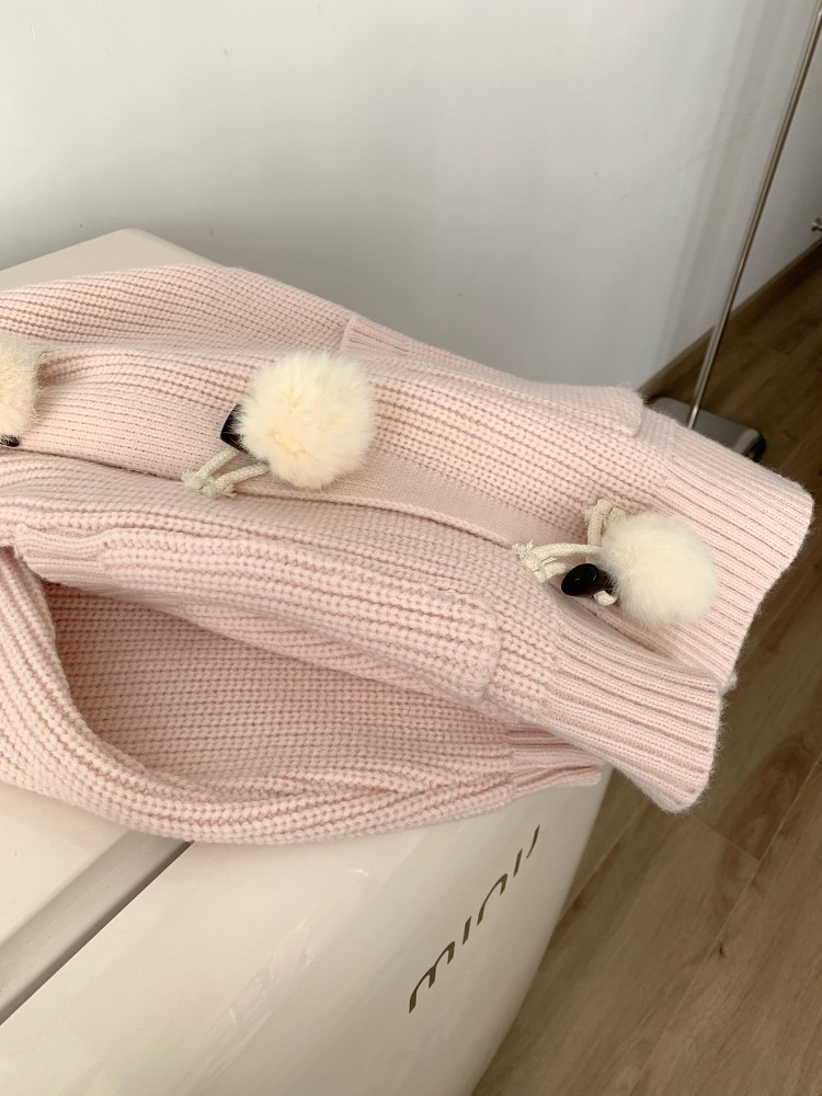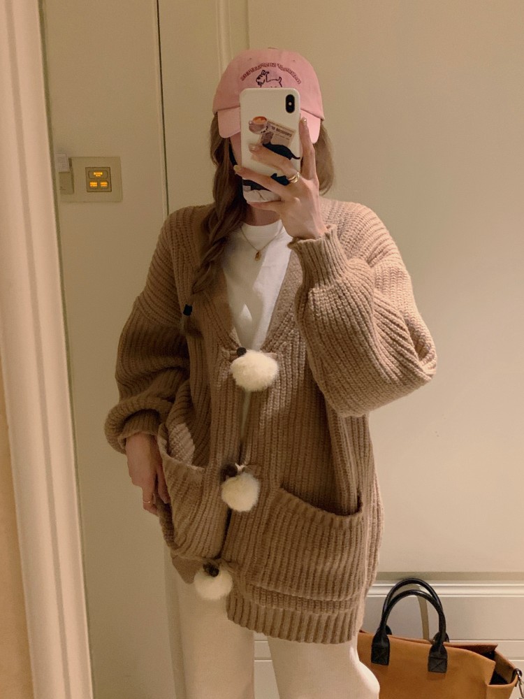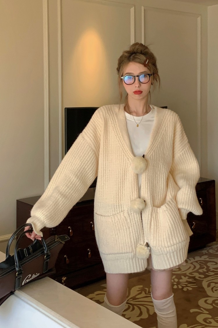 3 rabbit tail pom pom cozy knit cardigan