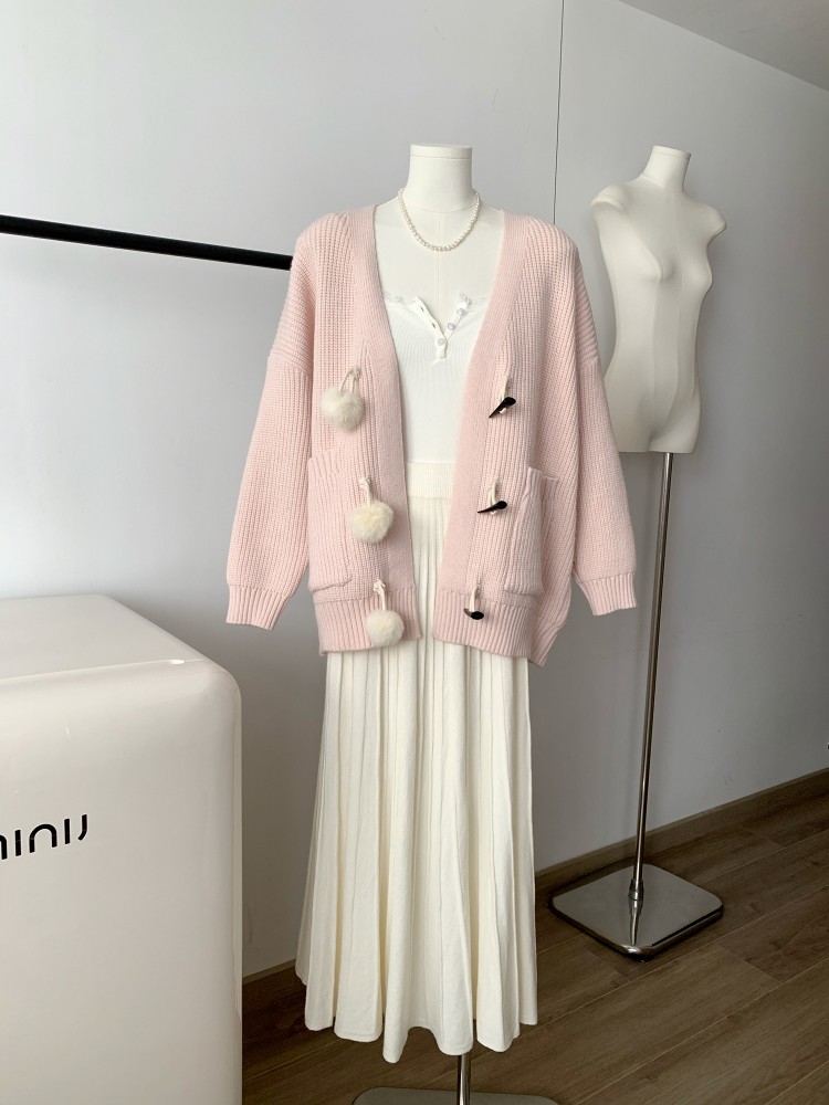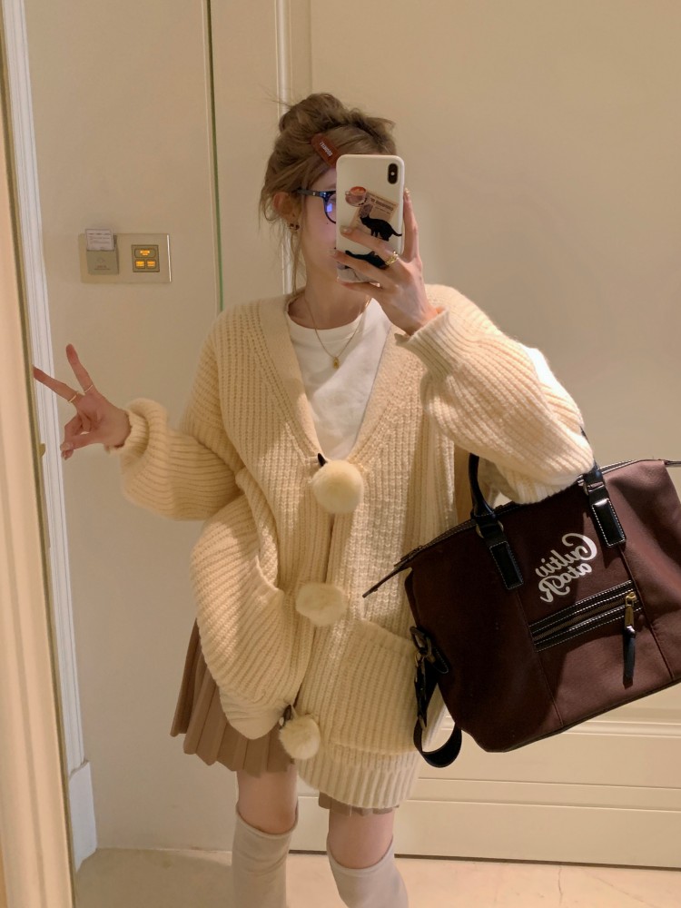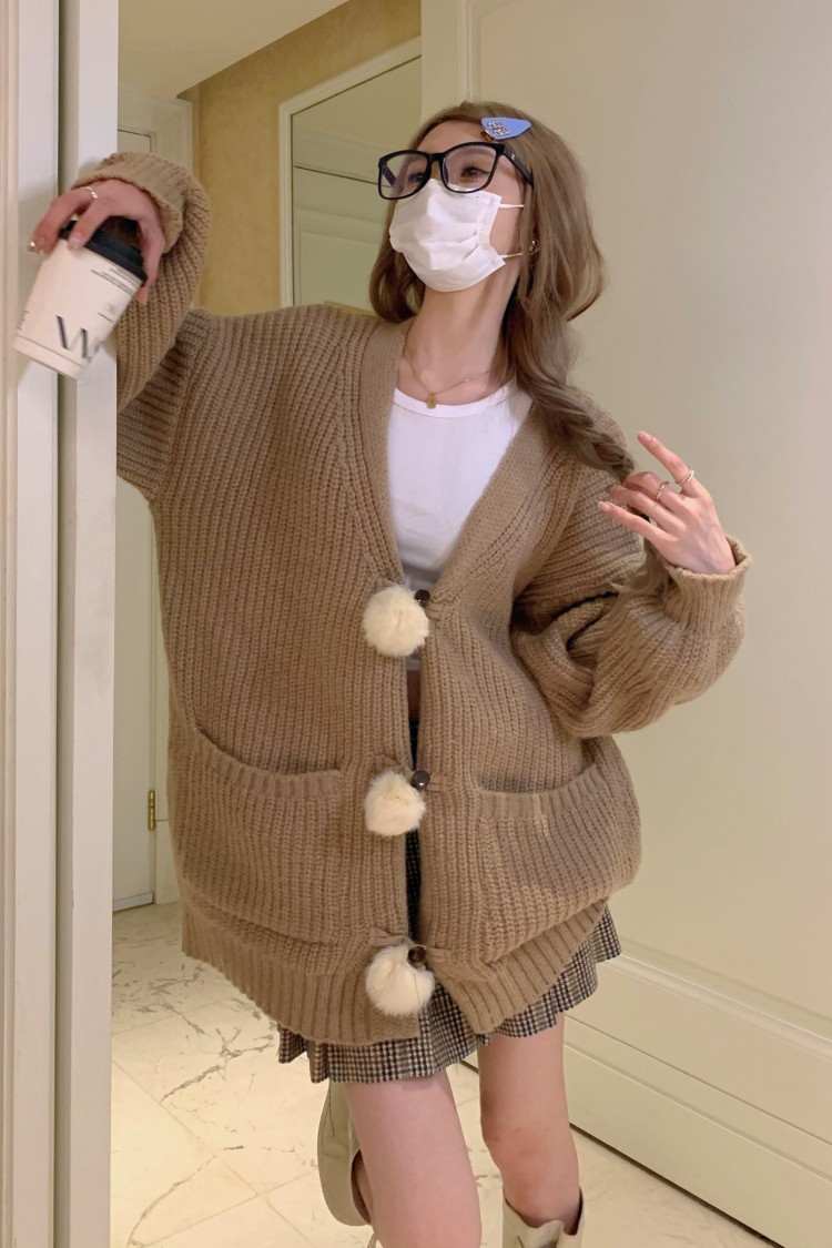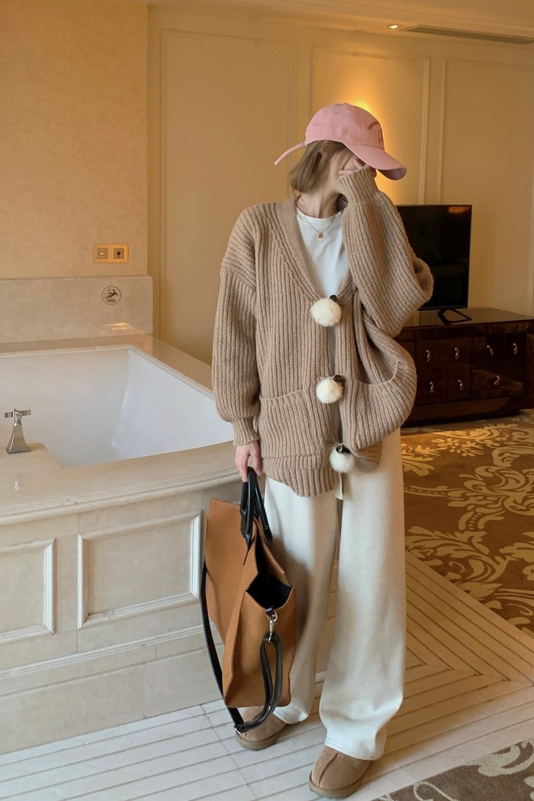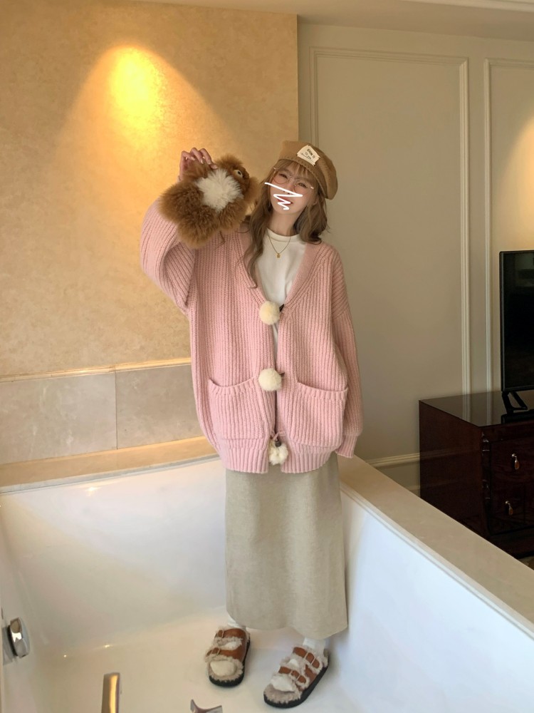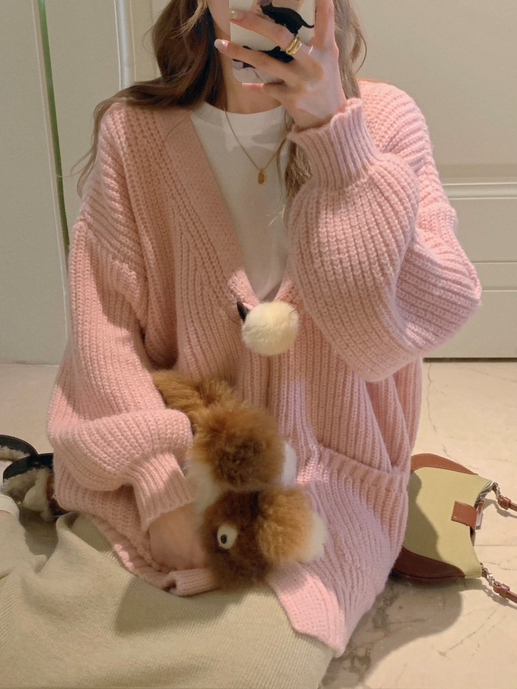 3 rabbit tail pom pom cozy knit cardigan
