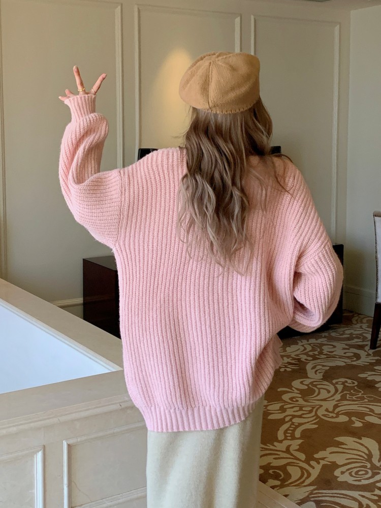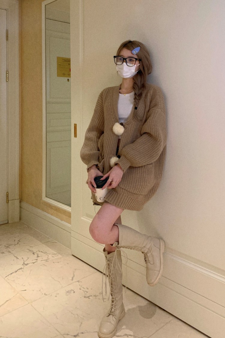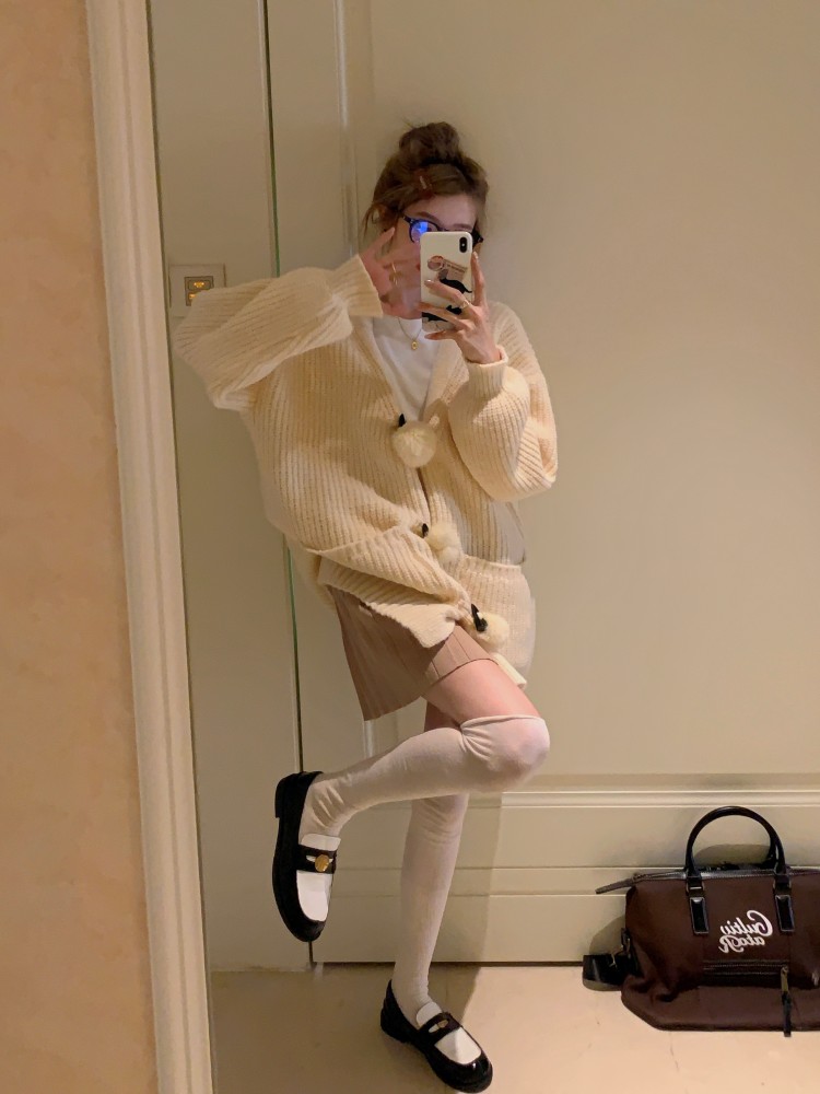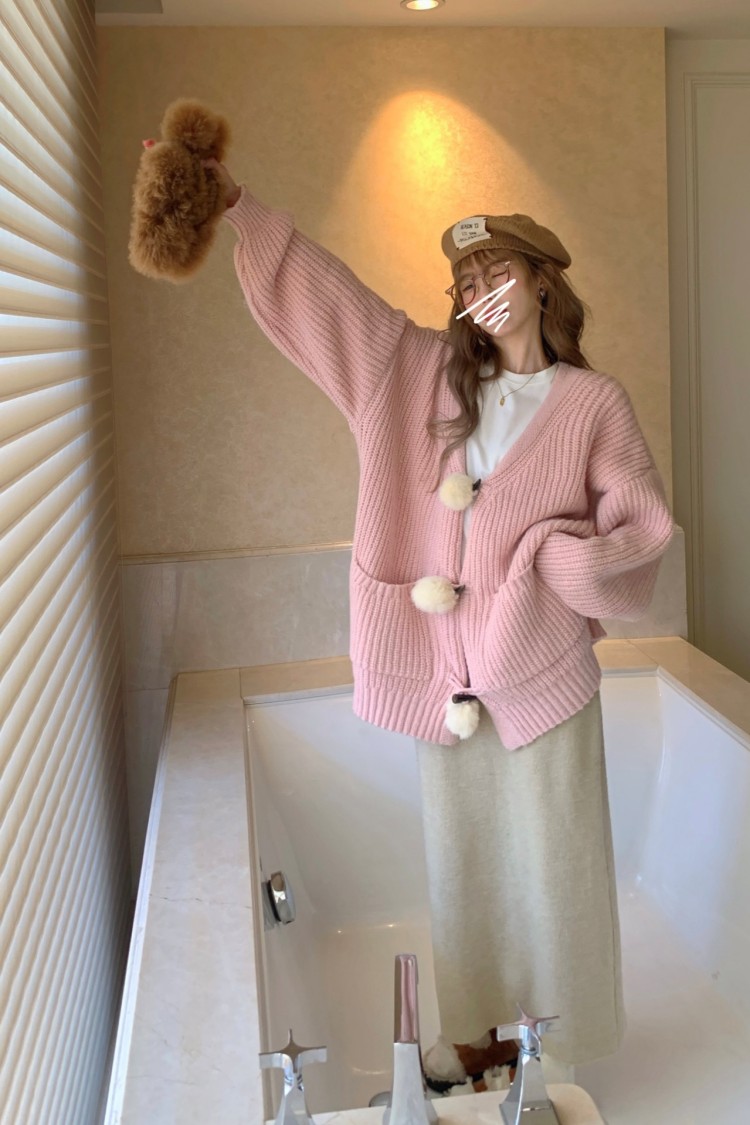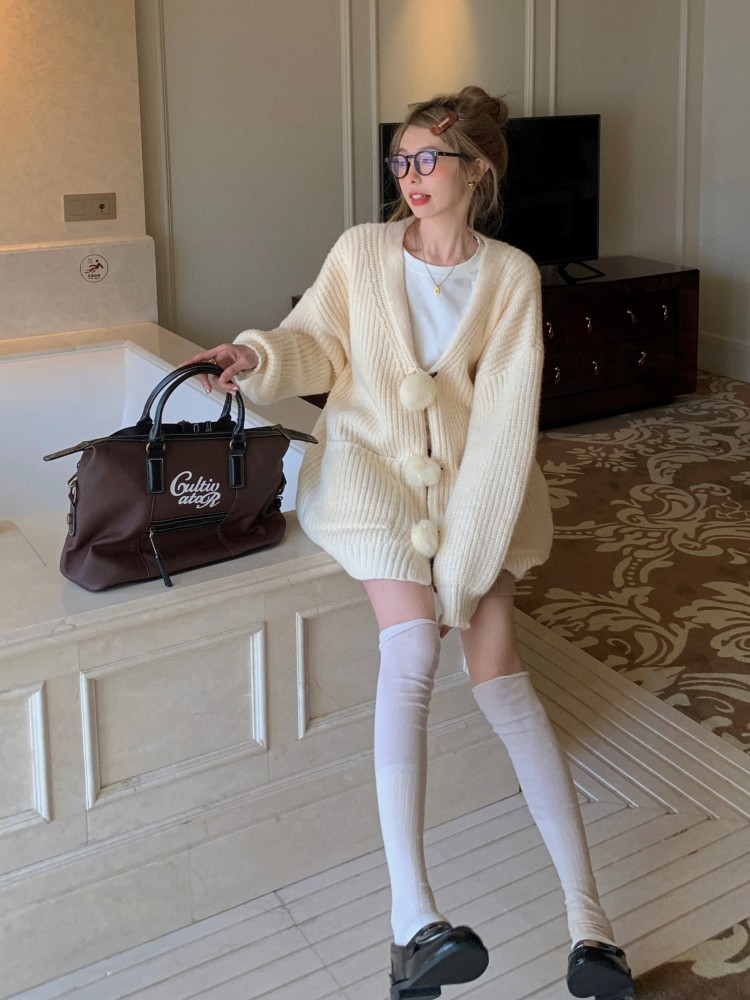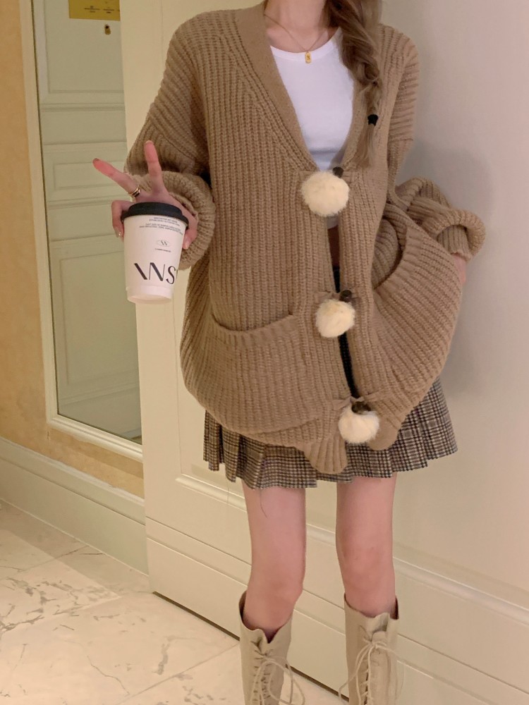 3 rabbit tail pom pom cozy knit cardigan
